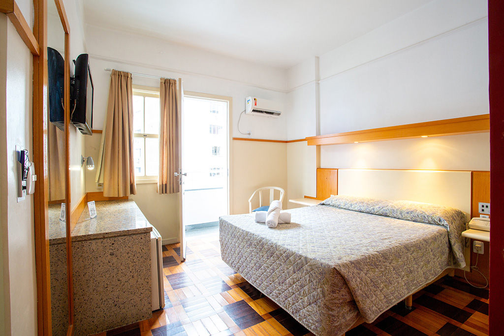 Os quartos estão equipados com: mesa de estudos, tomada , internet wireless, e ponto para internet a cabo, TV, frigobar, cofre individual, telefone, camas do tipo Box, banheiros práticos e higiênicos, toalhas da Teka e roupas de cama da Altenburg.